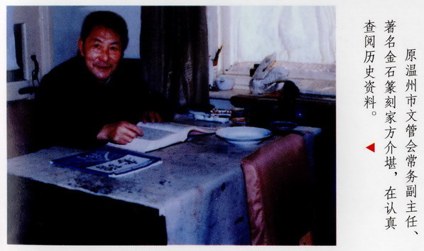 方介堪(1901—1987),原名文渠,字溥如,后改名岩,字介堪,别号玉篆楼主,以字行,永嘉城区(今鹿城区)人。先世居泰顺县,祖父养卿进府学,始著籍永嘉。父冠英,精书法,有名于时。因经商失利,家道中落。介堪幼进蒙塾,15岁为鼎源钱庄学徒。二年后依父设摊刻字,心灵手巧,术艺非常。民国9年(1924),从金石家谢磊明治印,协助选刻整篇古文辞印章。谢氏家富收藏,五年中得以广览印谱。勤学苦练,识艺大进。15年随邑绅吕文起赴沪,师事郸县赵叔孺,并以邻居关系结识经亨颐、柳亚子、何香凝等名流,以刻玉印驰名上海滩,加人西拎印社。上海美专校长刘海粟聘其任教篆刻,续在文艺学院(艺专)兼课。得和郑曼青、黄宾虹、张大千、马孟容等共事,广结墨缘;张大千尤称莫逆。全国首届美展在南市文庙举行,聘为评审委员。沪上收藏家求鉴定古印书画者踵相接。‘凡遇珍印异章,必钩摹保存,积久得古玉印摹本三百多方。24年至南京,寓居刻印一年。26年张大千邀赴北平,任故宫博物院博物馆试用科员,作品曾参加中山公园金石书画联展。抗战爆发后仓惶南归。时寇患日深,温州三度沦陷,父丧妻亡,困苦颠沛,无奈在当地贸易服务筹备处打杂。抗战胜利后,35年上学期在瑞安中学任教。此后复应张大千邀前往上海。次年,所刻“中兴元首”石章获第二届全国美展一等奖,成为上海美术家协会会员。后以母老回温,在百货公司大楼办过个人画展。解放初,投资50元参加丽田造纸厂工作。1952年起任温州地区(市)文物管理委员会副主任。1956年加人国民党革命委员会。历年征集故家遗藏,抢救出土文物,保护珍品,策划展览陈列,筹设温州博物馆,成绩卓著。至今馆藏文物名列全省前茅,实与当年辛勤有关。“文革”中受到冲击,抄家多次,印稿书籍毁失者大半。所幸耄耋之年,得见拨乱反正,被推为中国书法家协会名誉理事,西泠印社副社长,温州市文联副主席、市人民代表、省政协委员、市书协和美协名誉主席。1987年8月25日逝世。毕生从事艺术创作,擅长金石,先后治印二万余方,郭沫若评其印章“炉火纯青”,堪称篆刻大师。遗著有《方介堪篆刻》、《介堪手刻晶玉印》、《介堪印存》、《玺印文字别异》等。